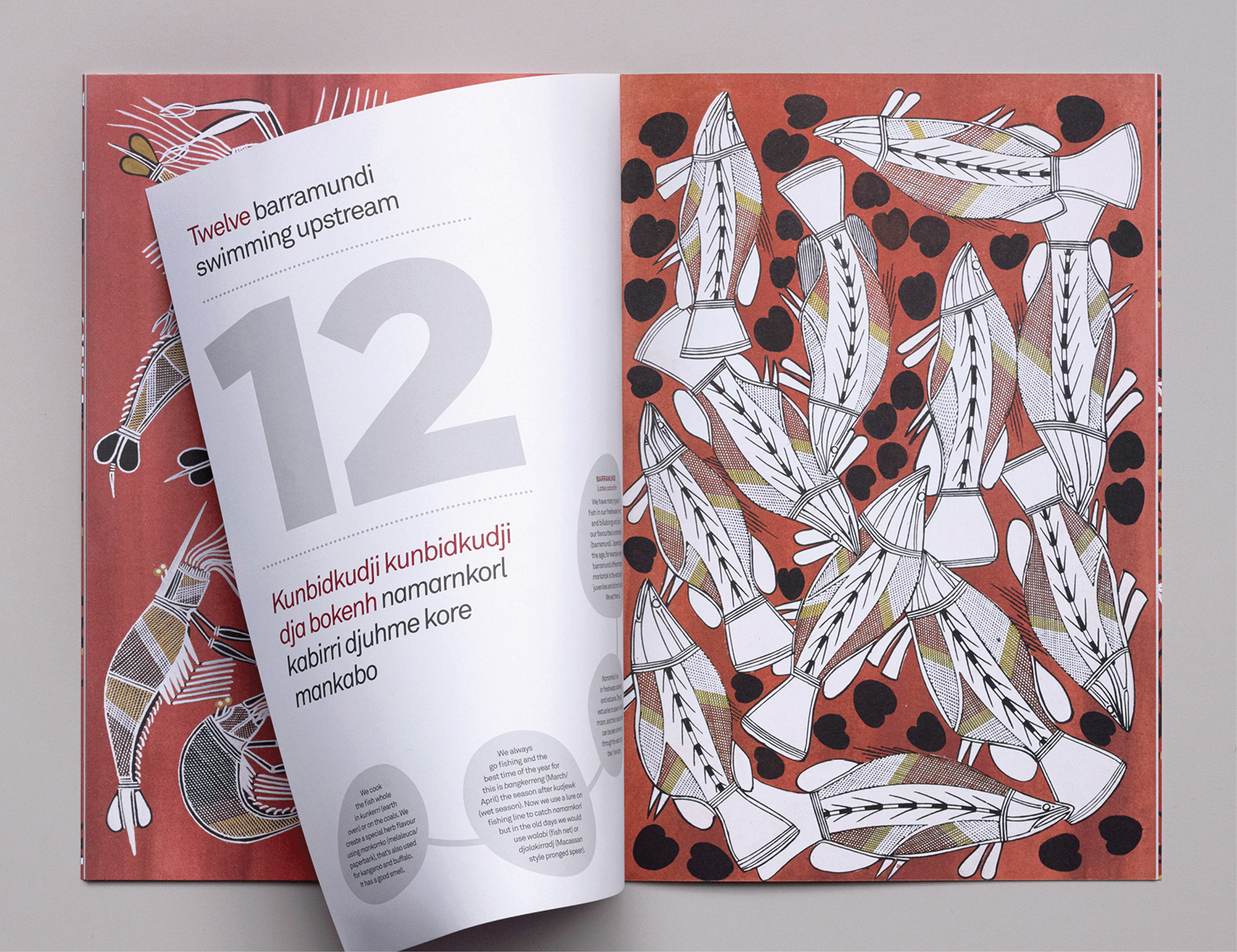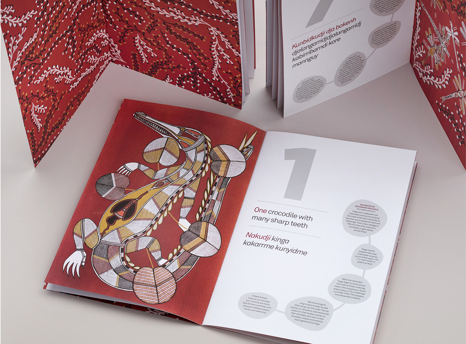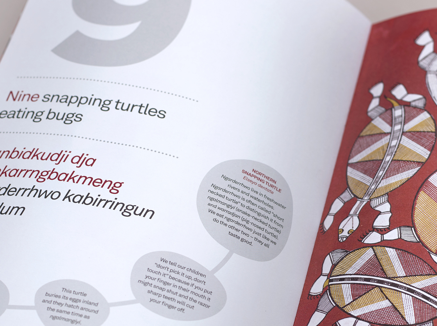 With low rates of literacy and numeracy among Indigenous children throughout Australia, the book was created with an emphasis on providing content that is local and relevant to Kunwinjku children. Each of the paintings are partnered with simple sentences suitable for small children in both English and the local language, and includes more detailed ecological and cultural information that appeals to older children and adults.
